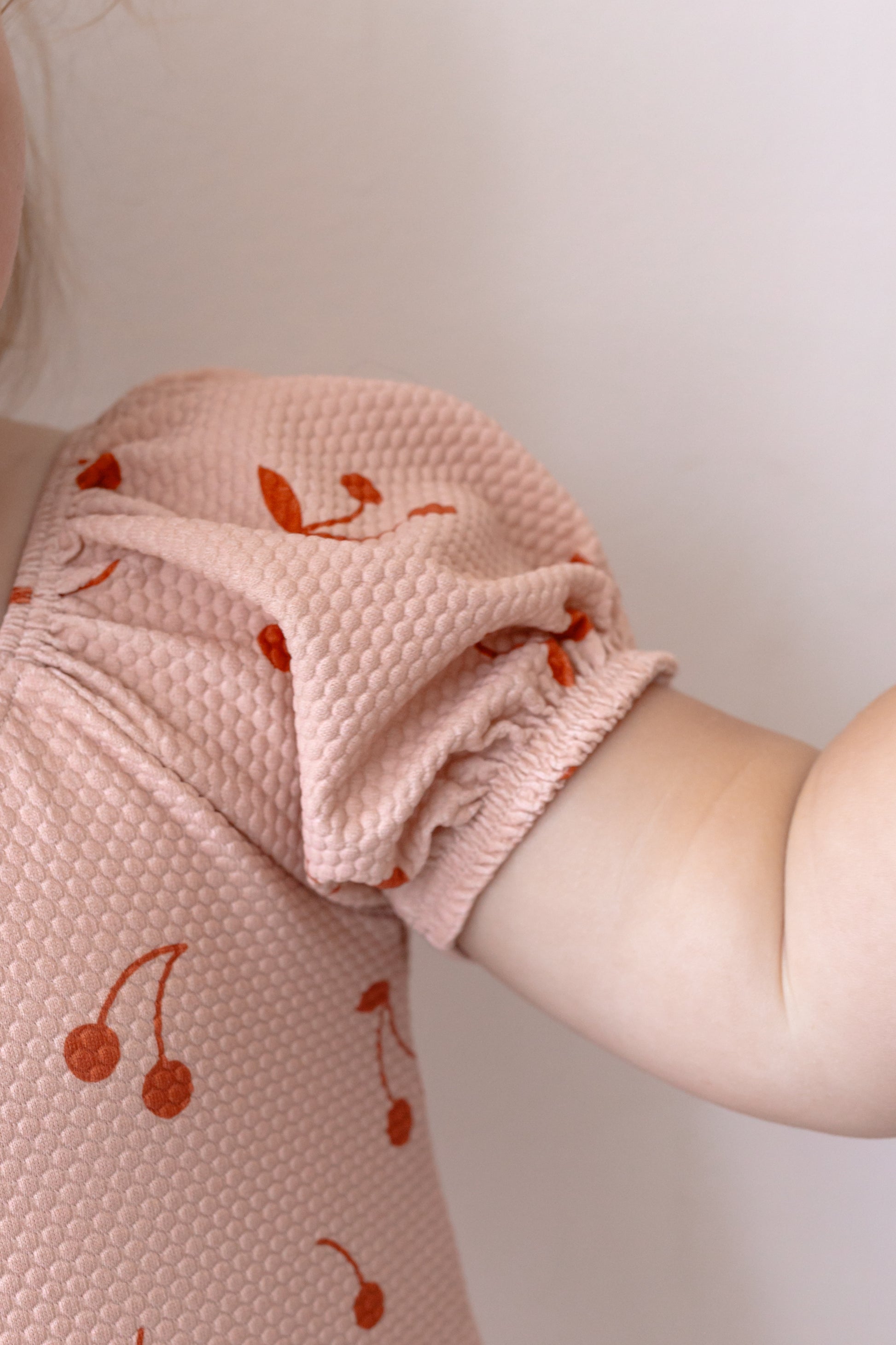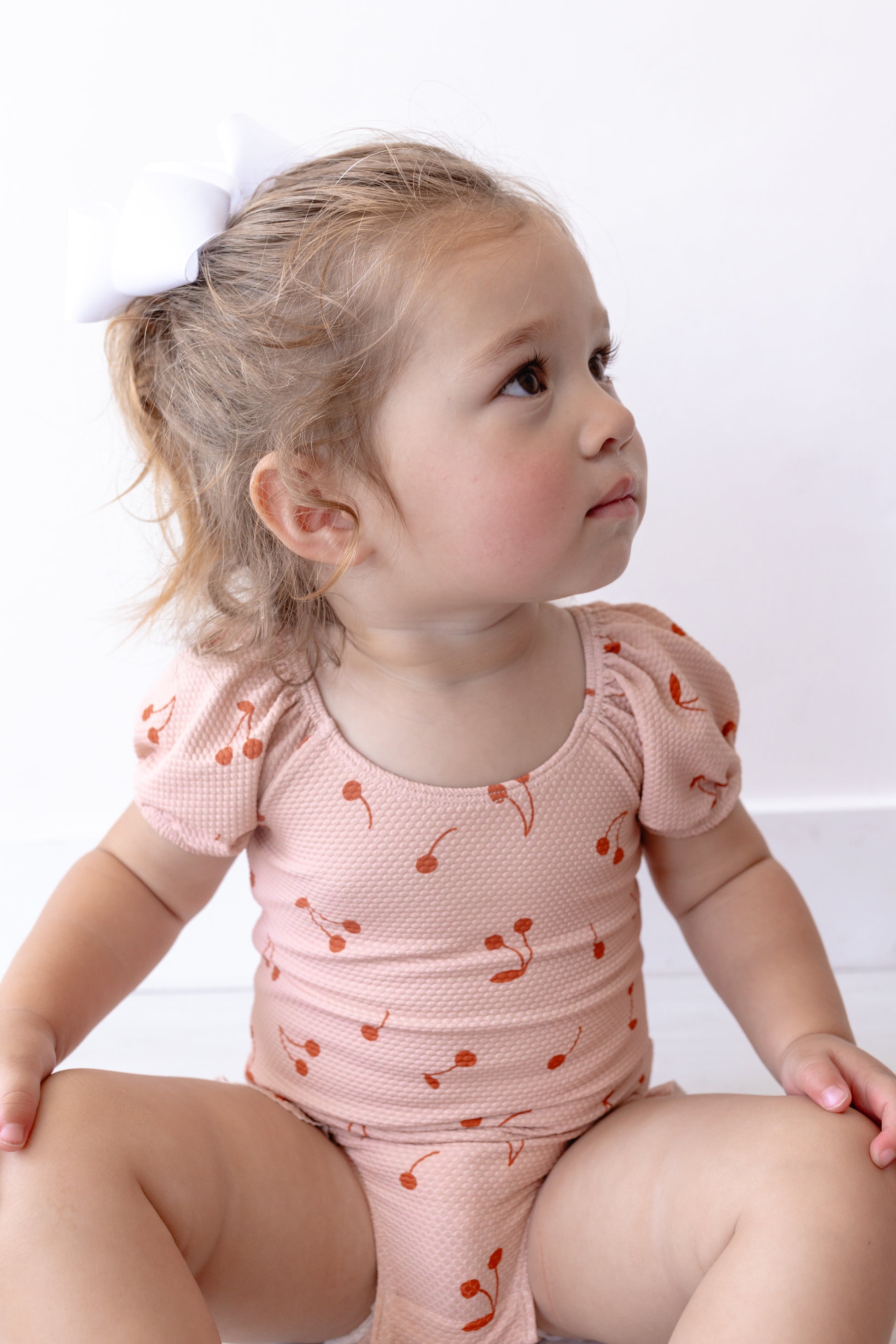 A bubble sleeve, ruffle hip detail, and the BEST print for summer! Snag this adorable cherry suit before it's gone.
