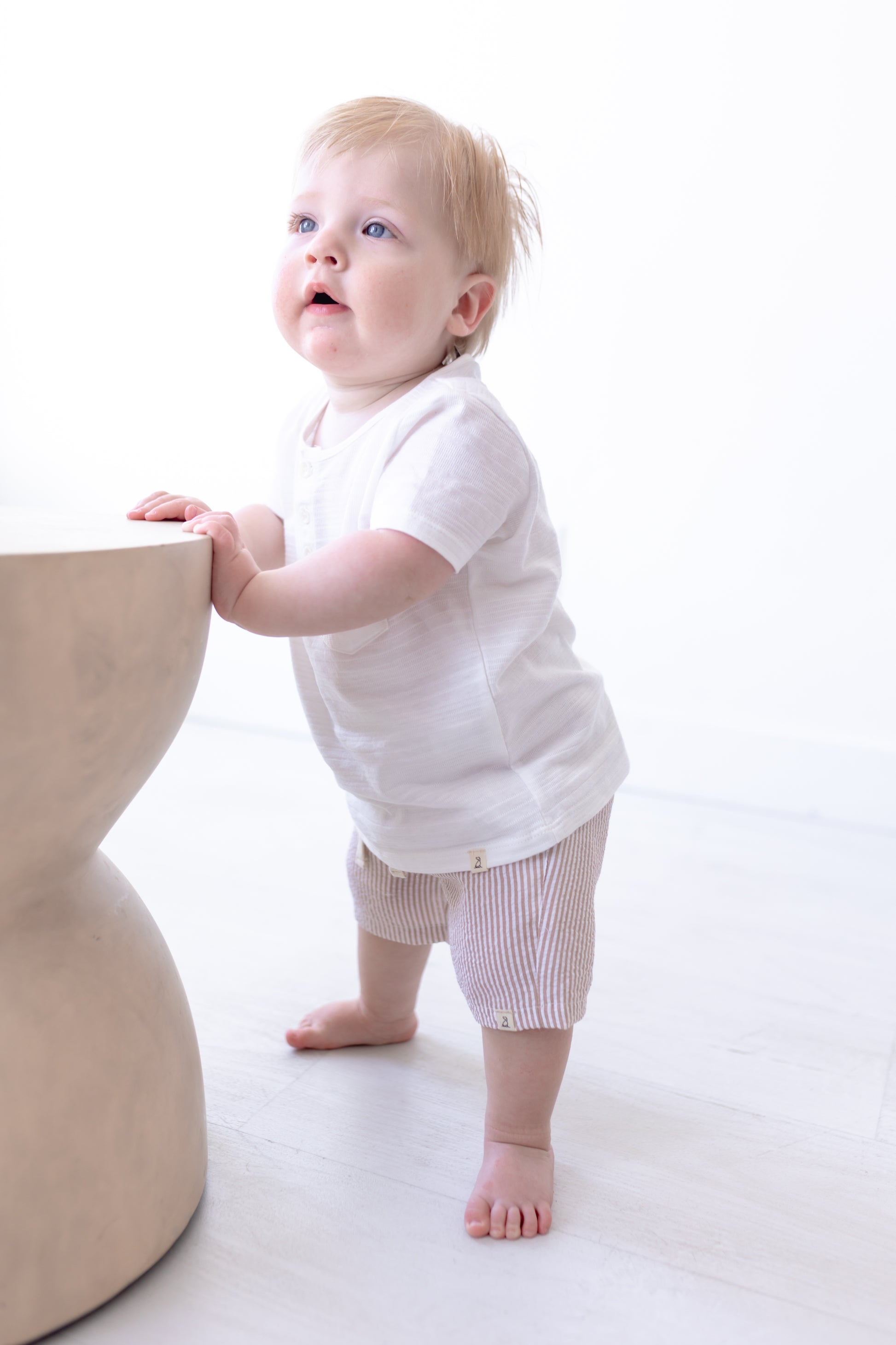 A timeless look for your summer loving boys! These brown and white seersucker shorts are a classic staple for his summer wardrobe.